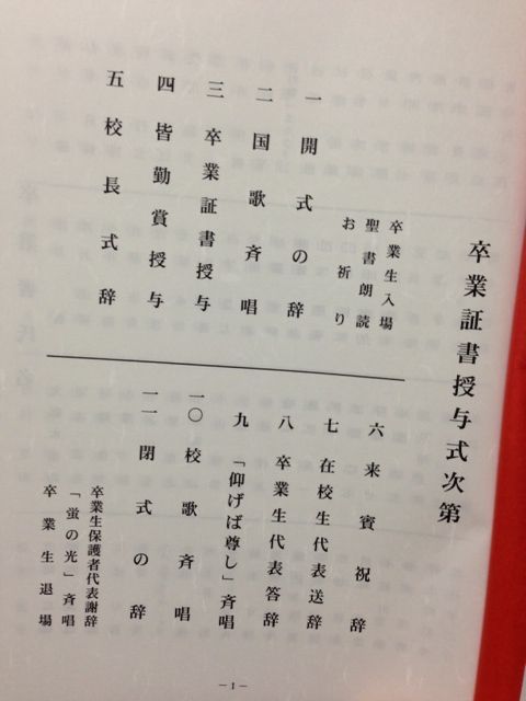 国歌、仰げばと尊し、校歌、を斉唱しているのを聴いて、ちょっとウルウルしちゃいました(泣)。しっかりと力強く生徒達が歌っている姿は、なかなか頼もしいです。