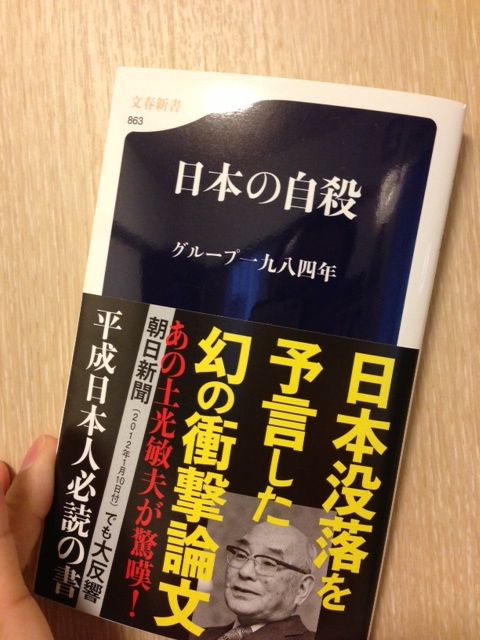 この本「日本の自殺」は、日本人の自殺者が多いという話ではなく、日本という国が自ら崩壊の方向に向かって進んでいる、と警告している本です。もともと、10年後の未来を1975年に予測して文藝春秋に掲載された論文で、1984年に文庫化された本なのですが、昨年2012年に新書化されました。今の時代のことを言い当てているような内容です。