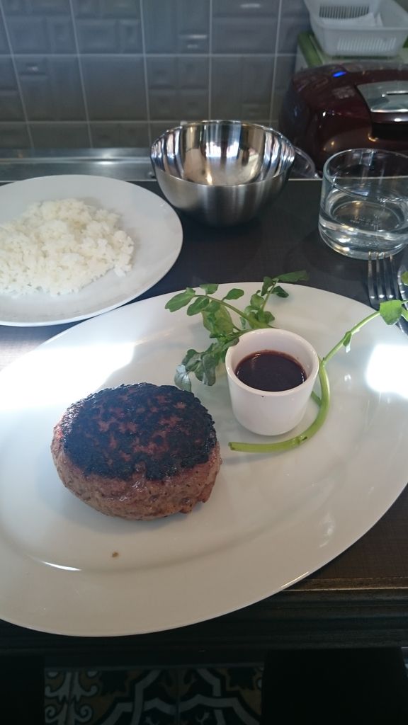 先にポテトが出てくるので、ハンバーグの待ち時間が短く感じましたね。写真が下手ですが、とてもジューシーで美味しいハンバーグですよ。
