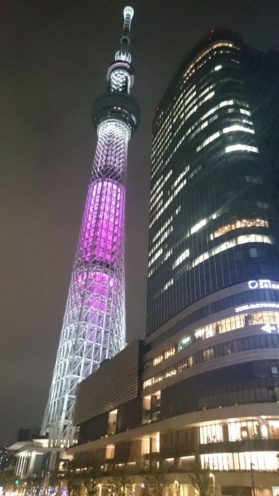 打ち合わせを終えてから食事に行きました。スカイツリーのほぼ真下だったので、かなり大きく感じますね。桜をイメージしてなのか、ピンク色にライトアップされていて綺麗です。
