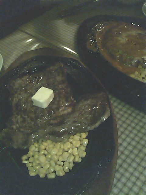 リブロースステーキ(300g)とチーズハンバーグステーキ(300g)を3人でシェアして食べました。ステーキは味付けされていないので、ステーキソース・塩・マスタード・ガーリックを使って自分で味付け。軟らかくて肉汁たっぷりで美味しいです。ハンバーグのほうは、隠れるくらいチーズがトッピングされていて、肉の塊のような昔ながらのハンバーグで最高です!