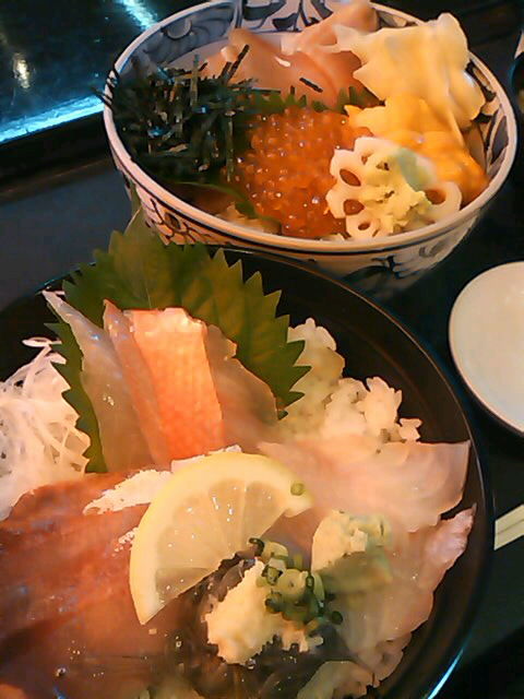私と妻は、3種の刺身と生しらすの「地魚丼(800円)」、息子はマグロとイクラとウニの「日替り丼(1050円)」、どちらもアサリの味噌汁付きです。